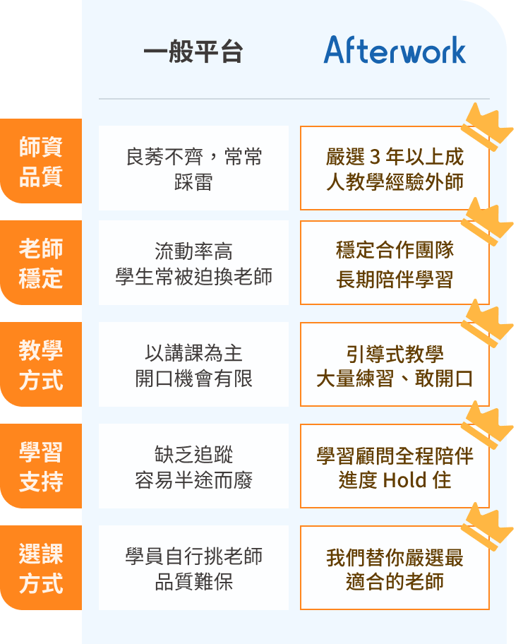 不要再冒險碰碰運氣了!選擇 Afterwork,讓專業師資和顧問陪你一起流利開口!