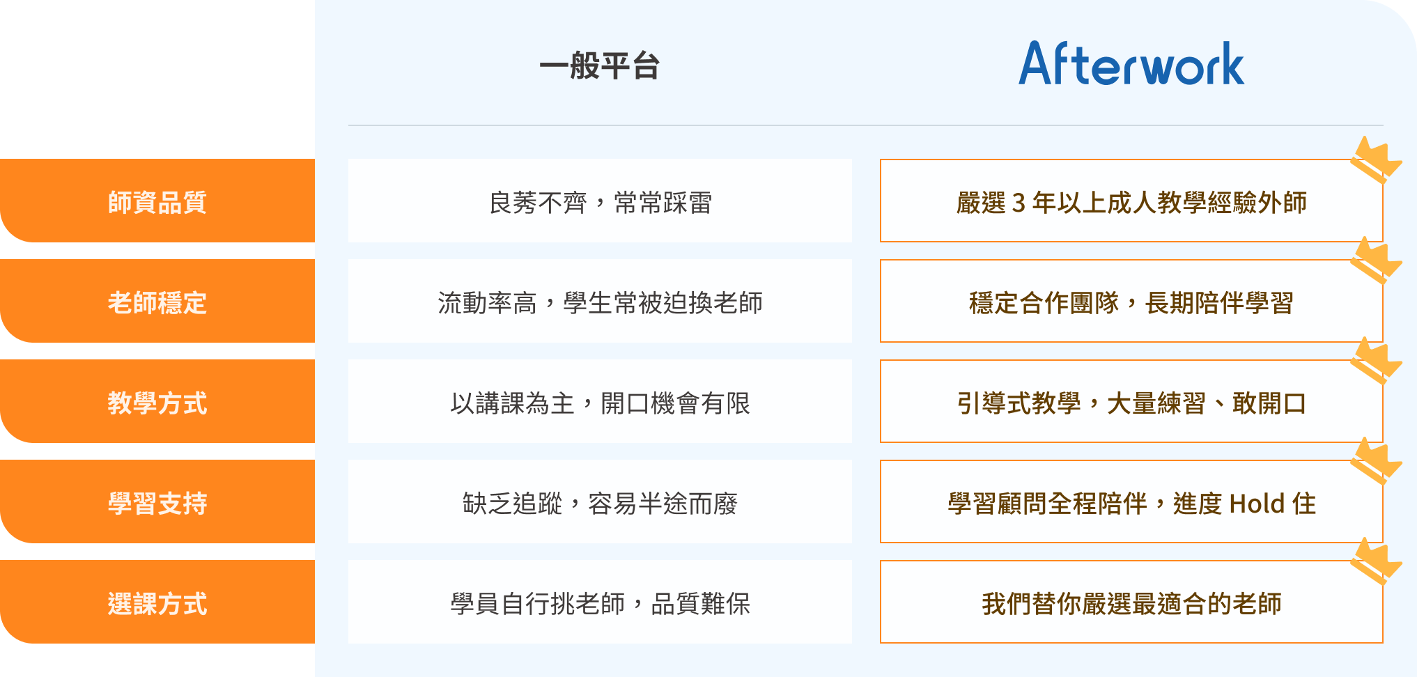 選擇方式沒有對錯,但如果你想要在真實情境中提升流暢度與表達力,Afterwork 是最適合的選擇。